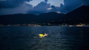 The course is a straight line crossing the lake. The positioning point of the first buoy on the opposite shore is indicated by a powerful beacon directed toward the sky. A second front buoy will be placed approximately 500 m from the swim exit point.